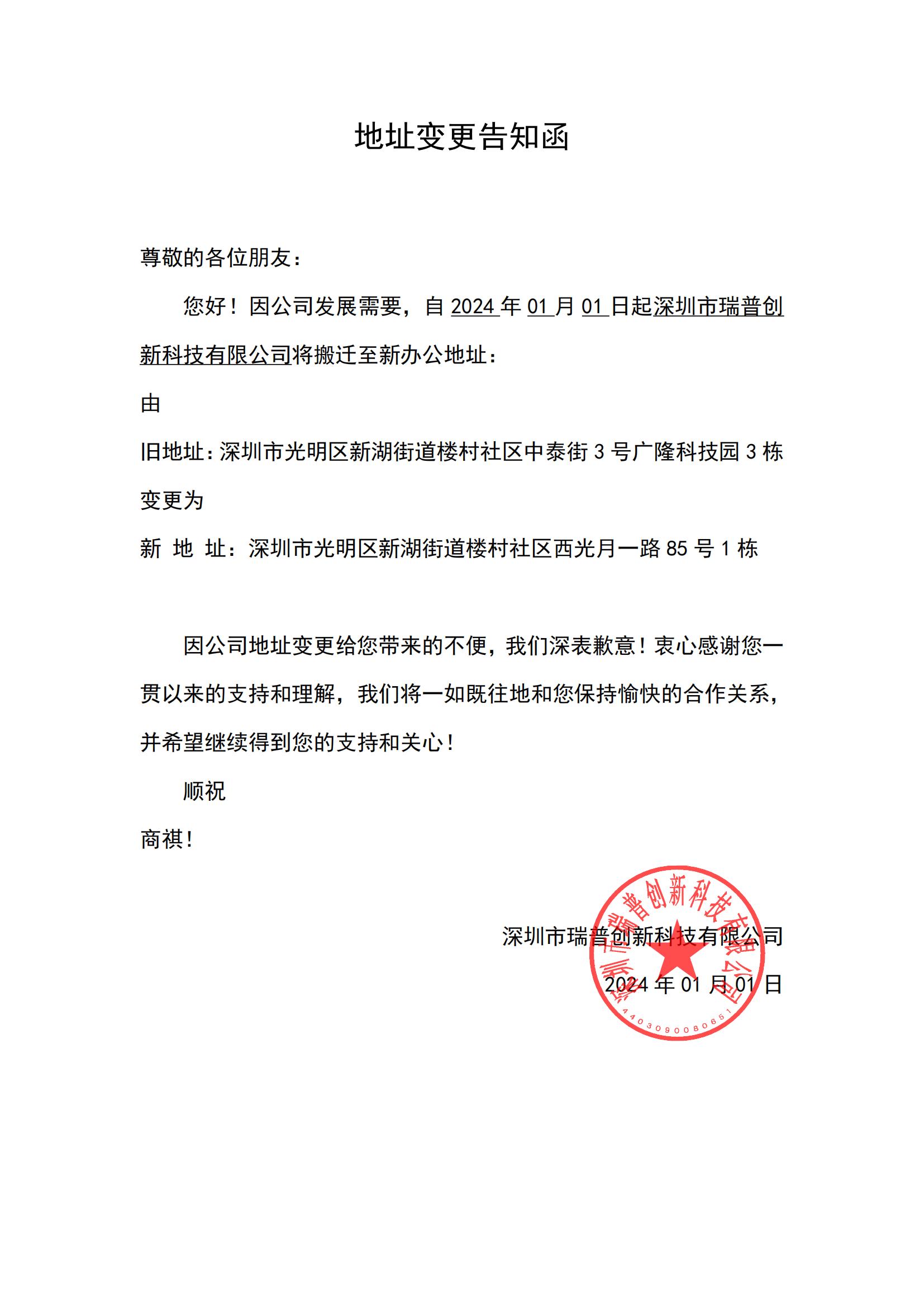 尊敬的各位朋友:您好! 因公司发展需要,自 2024 年 01 月01 日起深圳市瑞普创新科技有限公司将搬迁至新办公地址:中
