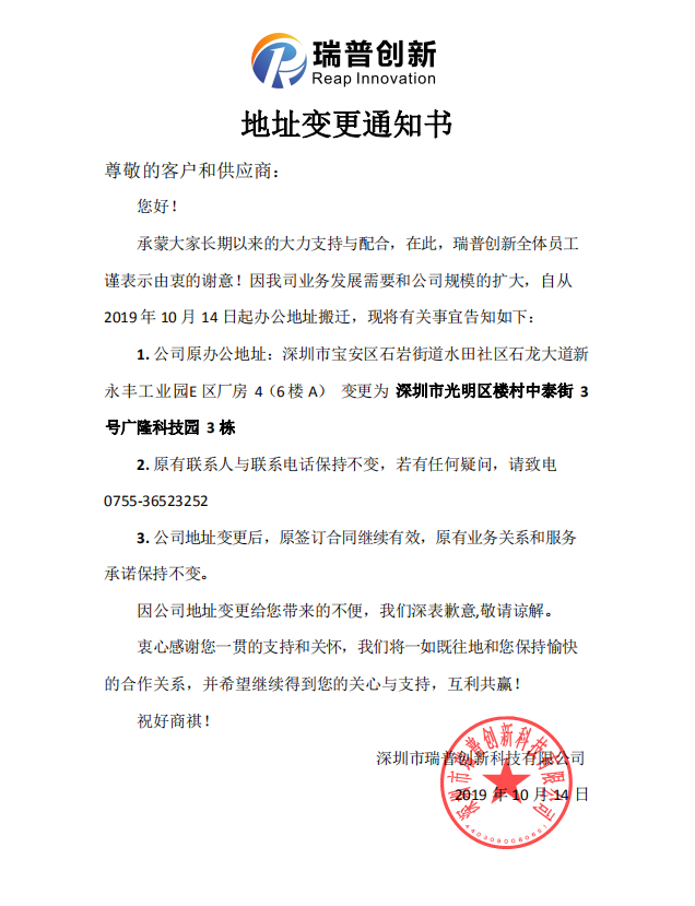 承蒙大家长期以来的大力支持与配合,在此,瑞普创新全体员工谨表示由衷的谢意!因我司业务发展需要和公司规模的扩大,自从2019年10月14日起办公地址搬迁,现将有关事宜告知如下: